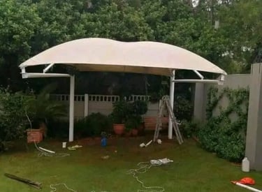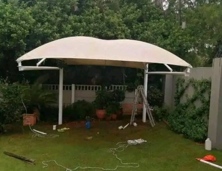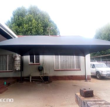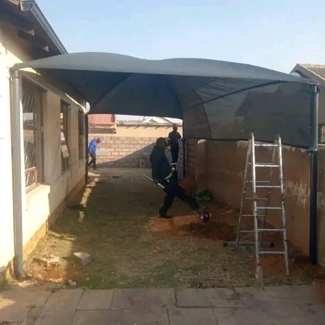 Custom-built carports protecting vehicles from sun and rain.